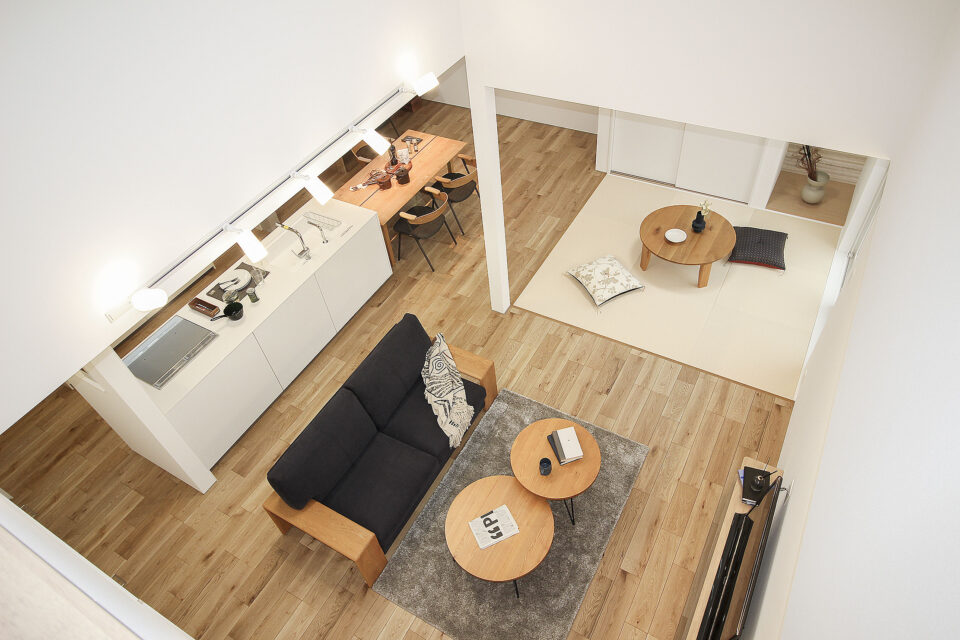 POINT1吹き抜けから明るい陽射しが降り注ぐLDK
