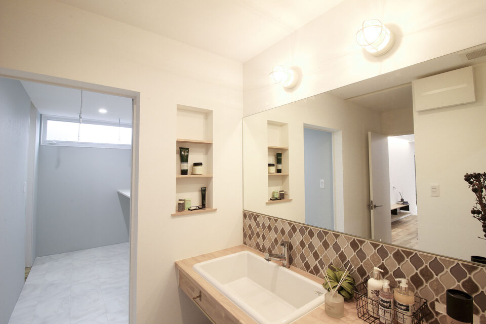 モザイクタイルでアクセントをつけた洗面台。洗面と脱衣場を分ける間取りが増えています。