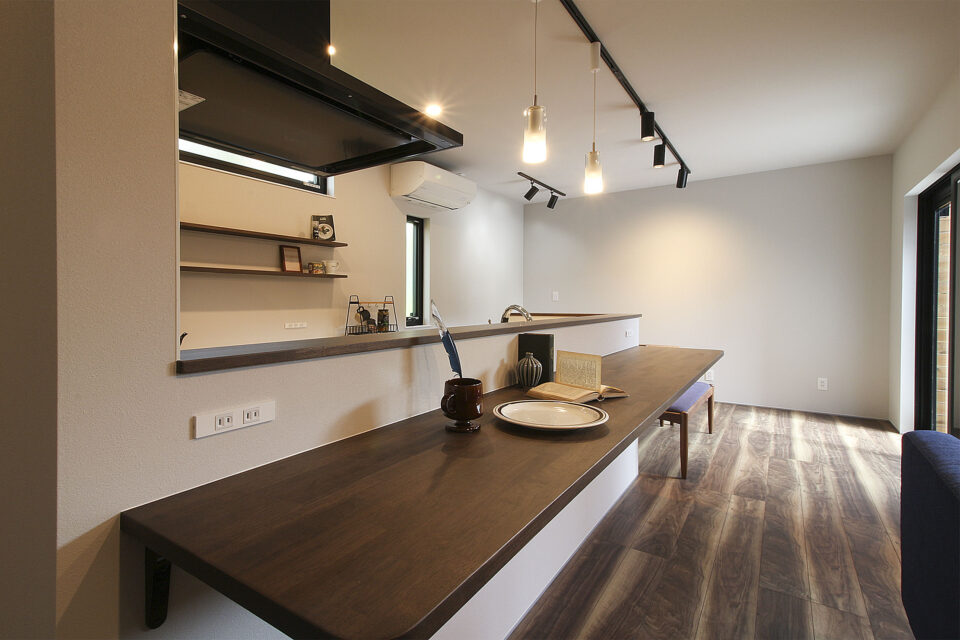 キッチン前には造作カウンターを設置しお子様の宿題スペースに◎