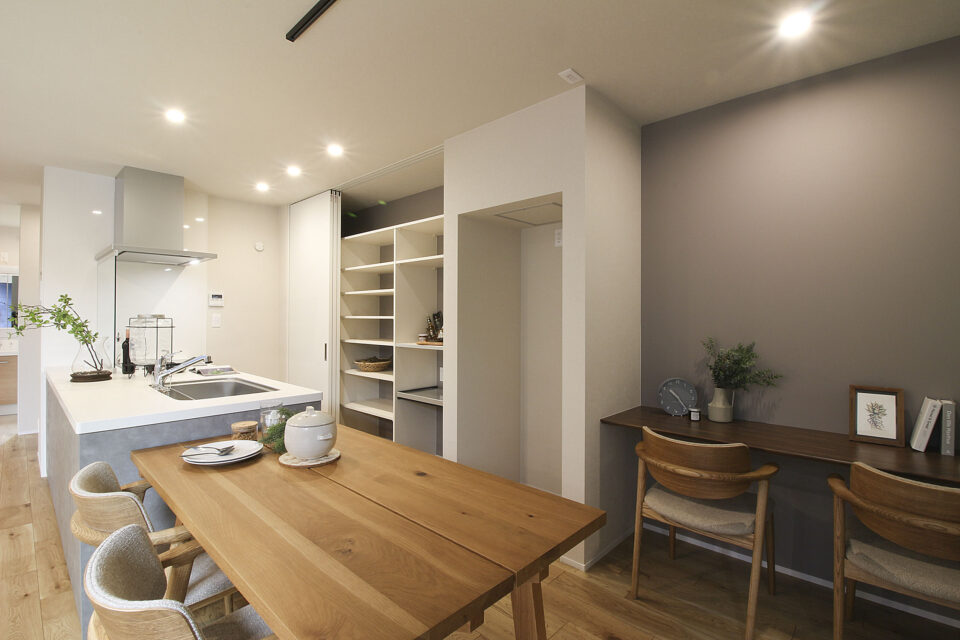背面にはパントリー兼収納を設け、生活感を上手に隠すことができます。キッチンと繋がる空間には造作のワークスペースを配置。家事や在宅ワークをしたりと家族の時間を大切にできる工夫です。