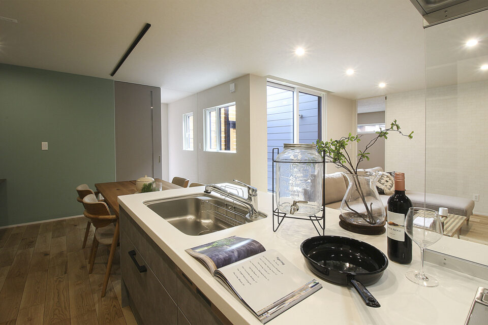 グレーのキッチンはLIXILのES。横並びのダイニングは配膳もスムーズ。