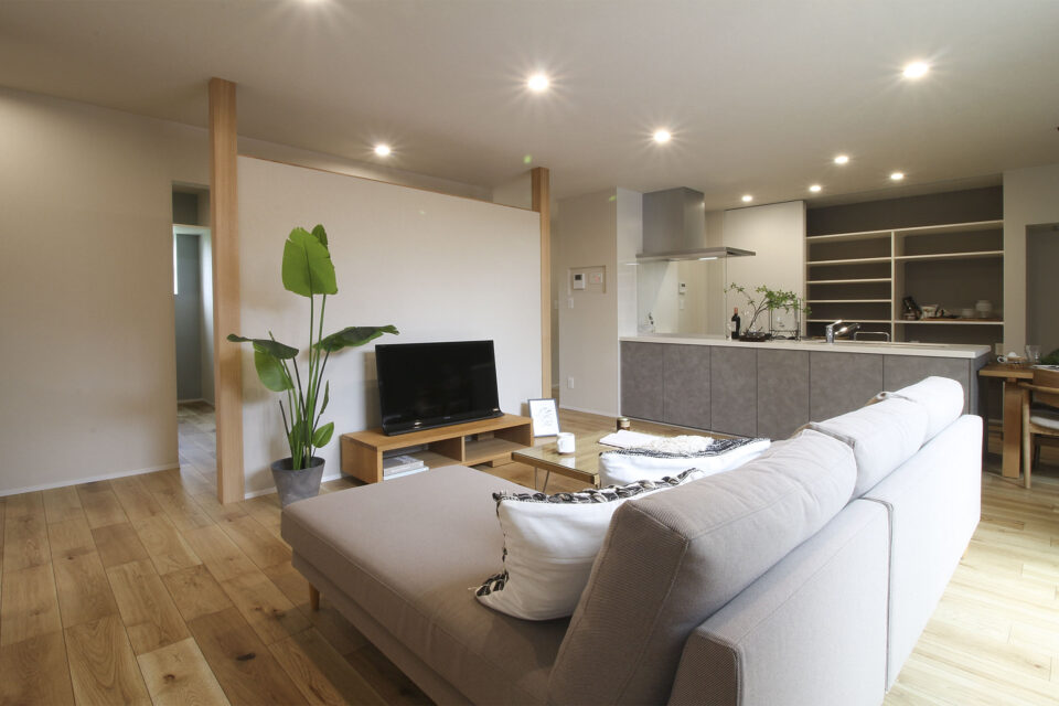 リビングの一角にパーテーションを設置することで空間を程よく仕切りながら、上部まで壁がないことで広がりを感じられる空間に。