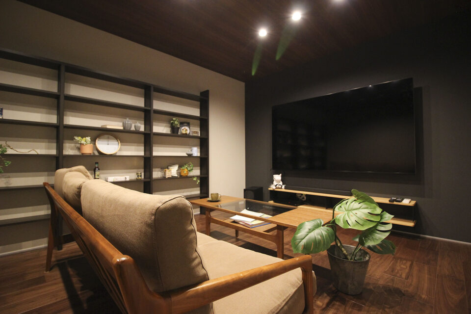 シアタールームは落ち着いたダークブラウンで統一し映画館の雰囲気を演出。防音ドアを採用しリビングへの配慮も。