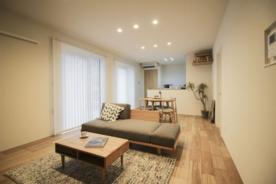 南向きの窓から光が差し込む明るいリビング。廊下をなくした間取りで家族がリビングを通り、自然と家族のコミュニケーションが生まれます。
