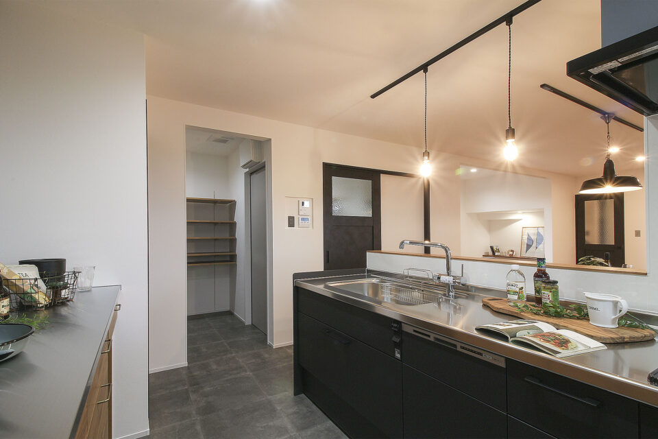 カップボードは木目とステンレス天板を組み合わせ温かみと清潔感を両立しました。奥にはパントリーを配置し、収納力も十分に確保しています。