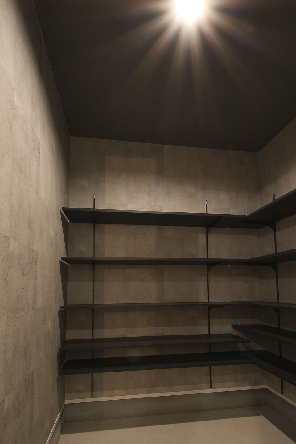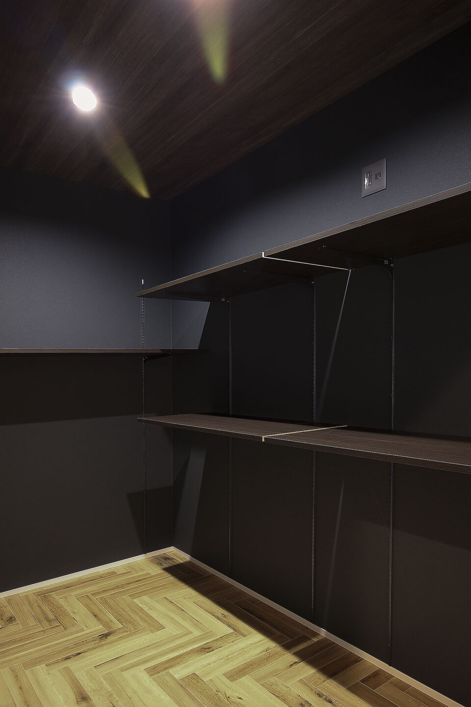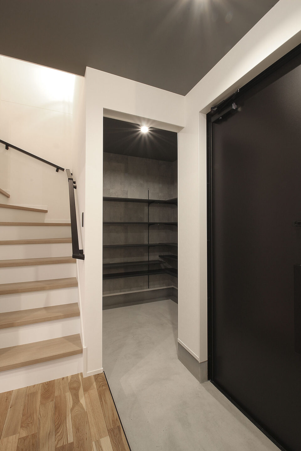 2帖のシューズクロークはコンクリート調クロスでかっこ良く。スタイリッシュでありながら機能的な空間です。
