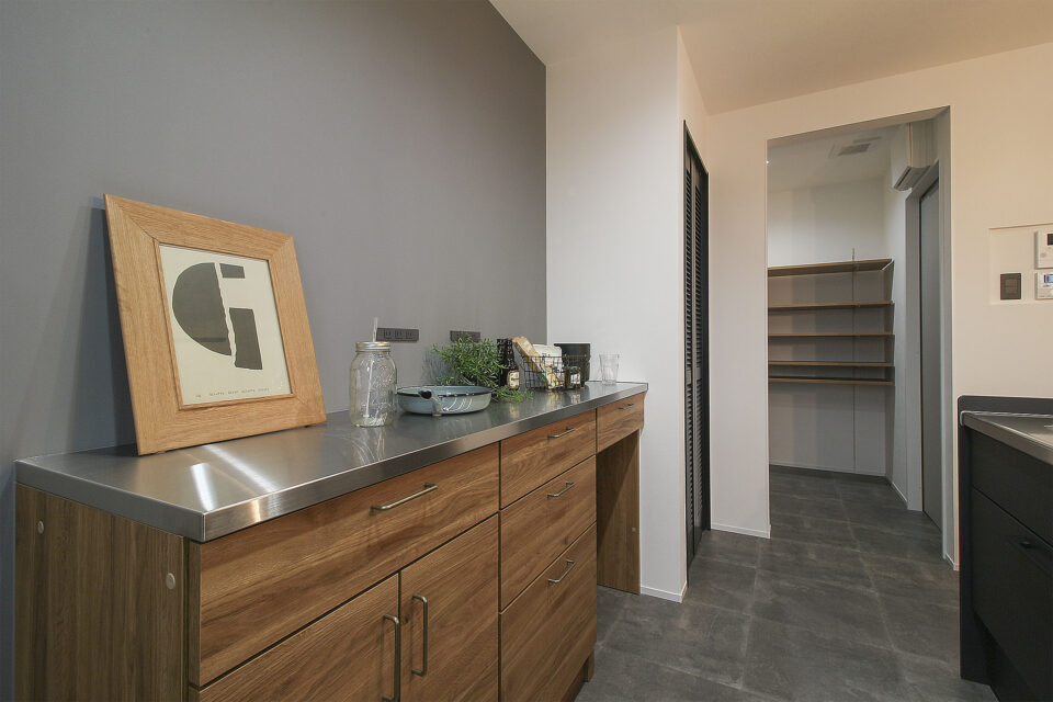カップボードは木目とステンレス天板を組み合わせ温かみと清潔感を両立しました。奥にはパントリーを配置し、収納力も十分に確保しています。