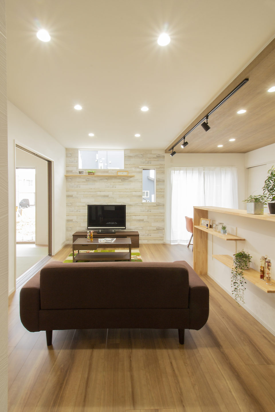 天井の木目クロスに設置されたライティングレール+スポットライト。