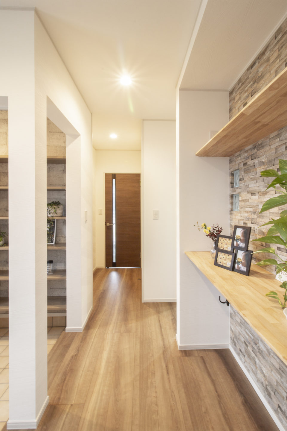 キッチンの腰壁に設けられた飾り棚には家族の写真や小物を飾ったり出来ます。キッチン収納は下部のみ設けて上部には飾り棚を設けるのも最近人気のスタイルです。